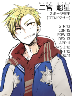 二宮 魁星(にのみや かいせい) キャラクター名:二宮 魁星(にのみや かいせい) 職業:ボクサー(スポーツ選手) 年齢:24 / 性別:男 キャラクターシート 設定 元ヤンのプロボクサー。 舎弟気質が強く、周りに感化されやすい。 だいたい何でもプラス思考で受け取る。 通過シナリオ ・グリッチ ・蒼々サイレン favoriteいいね送信中です×※コメントは最大500文字、5回まで送信できます送信送信中です送信しました!